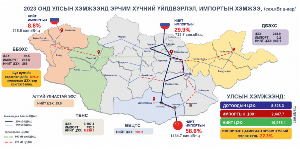 Манай улсын эрчим хүчний хэрэглээнийхээ 22.3 хувийг импортоор хангадаг. Импортын хэрэглээний 58.6 хувийг БНХАУ-аас, 38.7 хувь нь ОХУ-аас авдаг байна. Ингэхдээ урд хөршөөс авч байгаа эрчим хүчний гол хэрэглэгч нь Оюутолгой. Харин баруун болон төвийн бүсийн зарим хэрэглээг хойд хөршөөс авч хангадаг аж. Эндээс харвал Монгол Улс эрчим хүчний хэрэглээгээ дотооддоо бүрэн хангахын тулд сэргээгдэх эрчим хүчийг хөгжүүлэх шаардлага тулгарч байгааг салбарын мэргэжилтнүүд хэлдэг.