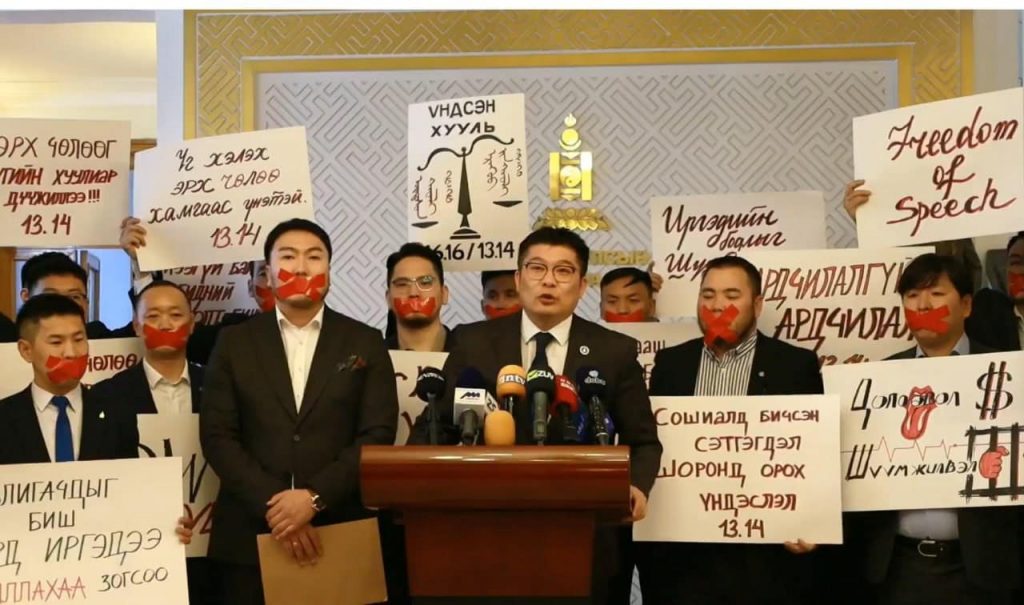 Энэ үеэр Ардчилсан Залуучуудын Холбооны Ерөнхийлөгч Б.Ган-Очир: "Үг хэлэх, үзэл бодлоо илэрхийлэх Үндсэн хуулиар олгогдсон бүх эрх зөрчигдөж байна. Монгол Улсын Үндсэн хуулиар бид бүгдийн үг хэлэх, үзэл бодлоо илэрхийлэх эрх нээлттэй байх ёстой. Гэтэл яг одоо иргэдийн сошиалд бичсэн шүүмжлэл шоронд орох үндэслэл болж эхэллээ. Сошиалд үгээ хэлж, үзэл бодлоо илэрхийлсэн сэтгүүлч нарын үг шоронд орох шалтгаан болж хувирлаа. Эрх баригчдыг долоовол доллар авдаг. Шүүмжилбэл шоронд ордог нийгмийг бий болгоод байна. Эрүүгийн хуулийн 13.14-р зүйл заалт бол Үндсэн хуулиар олгогдсон иргэдийн эрхийг зөрчиж байна. Бусдыг доромжилсон, үгүй бол гүтгэсэн, худал мэдээлэл тараасан гэдгээ Захиргааны журмаар шийдээч ээ, Эрүүгийн хуульд зааснаас болж хэвлэл мэдээлэл, сөрөг хүчний намууд, сэтгүүлчид эрх чөлөөгүй болж байна.