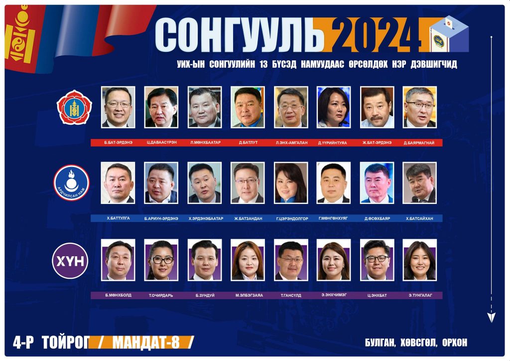 Танилц: 4-р тойрог: Булган, Хөвсгөл, Орхон аймгуудад МАН, АН, ХҮН-ээс нэр дэвшигчид: