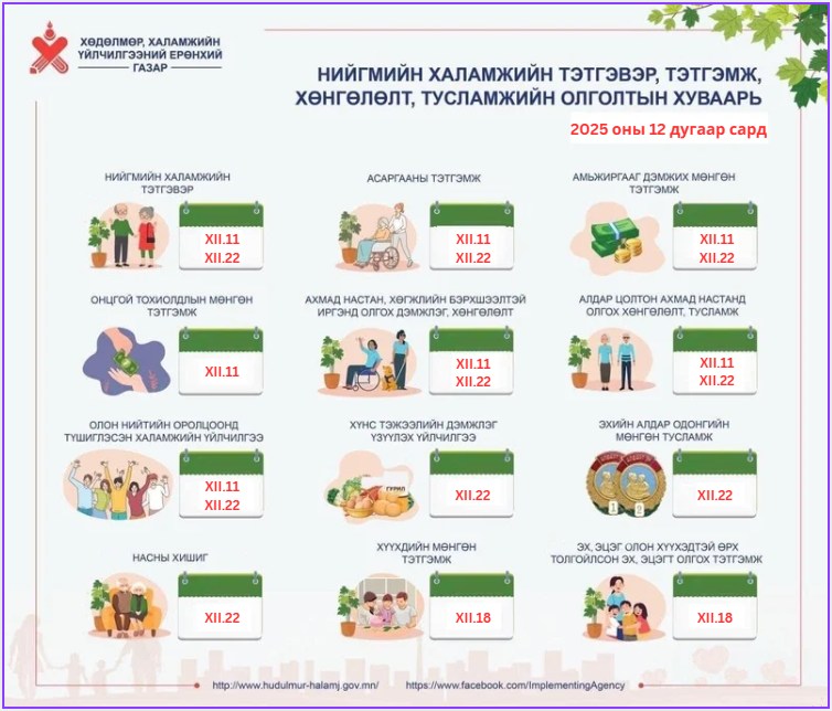 Энэ сард олгох нийгмийн халамжийн тэтгэвэр, тэтгэмж, хөнгөлөлт, тусламжийн хуваарь admin 54 минутын өмнө Нийгмийн халамжийн тэтгэвэр, тэтгэмж, хөнгөлөлт, тусламжийн 2025 оны 12 дугаар сарын олголтын хуваарийг танилцуулж байна. Уншсан: 181 Share Tweet Share Үргэлжлүүлэн унших Өмнөх: ТҮЦ-нээс ялгаагүй болсон CU-г хааж монгол дэлгүүрүүдээ ажиллуулъя Холбоотой мэдээ ТҮЦ-нээс ялгаагүй болсон CU-г хааж монгол дэлгүүрүүдээ ажиллуулъя ТҮЦ-нээс ялгаагүй болсон CU-г хааж монгол дэлгүүрүүдээ ажиллуулъя 3 7 хоногийн өмнө Энэ сард олгох нийгмийн халамжийн тэтгэвэр, тэтгэмж, хөнгөлөлт, тусламжийн хуваарь Энэ сард олгох нийгмийн халамжийн тэтгэвэр, тэтгэмж, хөнгөлөлт, тусламжийн хуваарь 3 7 хоногийн өмнө Хот суурийнгийн цаг агаарын урьдчилсан мэдээ илүү богино хугацааны нарийвчлалтай хүрдэг боллоо Хот суурийнгийн цаг агаарын урьдчилсан мэдээ илүү богино хугацааны нарийвчлалтай хүрдэг боллоо 4 7 хоногийн өмнө