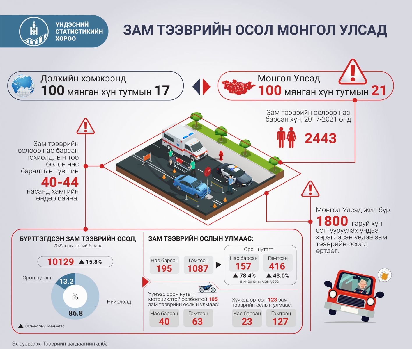 2022 оны эхний тавдугаар сарын байдлаар улсын хэмжээнд 10129 зам тээврийн осол бүртгэгдсэн нь өмнөх оны мөн үеэс 1382 нэгжээр буюу 15.8 хувиар өсөж, нийт ослын 8796 буюу 86.8 хувь нийслэлд, 1333 буюу 13.2 хувь нь орон нутагт бүртгэгдсэн байна.