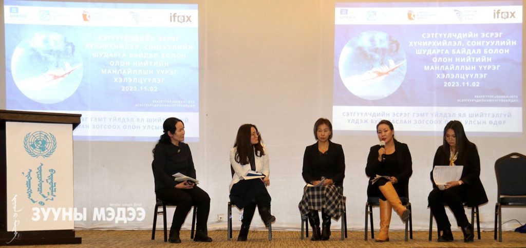 Хуульч, судлаач Л.Галбаатарын илтгэлд дурдсанаар Монгол Улс сэтгүүлчдийн аюулгүй байдлаараа олон улсад 79.3 оноотой, 180 улсаас 71 дүгээр байрт жагсчээ. Хэдийгээр энэ нь чамлахааргүй үзүүлэлт мэт боловч сэтгүүлчид ажил үүргээ гүйцэтгэх явцдаа халдлага, дарамт, олон нийтийн доромжлол, гадуурхалд өртөх байдал сүүлийн жилүүдэд нэмэгдэж байна. Ялангуяа, төрийн байгууллага, улстөрчид, хууль хүчний байгууллагаас сэтгүүлчдийг хорьж цагдах, айлган сүрдүүлэх байдлаар жил дамжин байцаалт мэдүүлэг авч залхаан цээрлүүлж эр зоригийг нь мохоож байна гэдгийг хэвлэл мэдээллийн байгууллагууд бодит кейсээр гаргаж тавилаа. Сэтгүүлчдийн аюулгүй байдал ба үзэл бодлоо илэрхийлэх, мэдээлэл авах эрх чөлөө зөрчигдсөн кейс хэлэлцүүлгийн хэсэгт МСНЭ-ийн, Мэргэжлийн ёс зүйн хороо хариуцсан дэд ерөнхийлөгч З.Боргилмаа, “Зууны мэдээ” сонины Хариуцлагатай нарийн бичгийн дарга Х.Мөнхжаргал, “Гэрэл ньюс” агентлагийн эрхлэгч Г.Гэрэлмаа, "Өрөг" сайтын эрх зүйч Э.Тамир нар өөрсдийн редакцид тулгарсан кейс болоод гарц шийдэл ярив. Ялангуяа сонгуулийн үеэр сэтгүүлчдийн эрх зөрчигддөг. Улс төр, мөнгө төгрөгтэй холбож харлуулдаг, төрийн албан хаагчид буруутгах явдал эрчимждэг гэдгийг З.Боргилмаа хэлсэн. “Зууны мэдээ” сонины Хариуцлагатай нарийн бичгийн дарга Х.Мөнхжаргал “Өдөр тутмын сонин баталгаатай, үнэн бодит, тэнцвэртэй мэдээлэл бэлтгэн хүргэдэг учраас хууль хяналтын байгууллагад дуудагдах нь харьцангуй цөөн. Ихэнхдээ улстөрчидтэй холбоотой авлига, албан тушаалын томоохон асуудлаар гомдол гаргадаг. Ямар нэг гомдол, хууль хяналтын байгууллагатай холбоотой асуудал гарлаа гэхэд редакц бүх талаар сэтгүүлчдээ хамгаалдаг. Өдөр тутам ажиллаж байгаа сэтгүүлчдээ хууль хяналтын байгууллагын үүд сахиулаад байх юм бол шантарна, эр зориг нь мохно” гэдгийг онцлов. Харин “Гэрэл ньюс” агентлагийн эрхлэгч Г.Гэрэлмаа “Ажлаа хийж олон нийтийг мэдэх эрхээр хангах үүргээ биелүүлснийхээ төлөө халдлагад өртсөн, хоригдсон. Цагдаагийн албан хаагчид гар утасны бүх мэдээллийг устгасан. 2-3 жил шалгагдаж дарамтлуулаад аргагүйн эрхэнд АНУ-ын Элчин сайдын яаманд хандсан. Төрийн албан тушаалтнууд сэтгүүлчдийг ялгаварлан гадуурхаж, мэдээлэл өгөхөөс татгалзаж илт доромжилж харьцдаг байдал газар авсан” гэсэн. Харин цагдаагийн байгууллагын зүгээс “Сэтгүүлч гэлтгүй жирийн иргэн аюул заналхийлэлд өртсөн бол цагдаад хандах боломжтой. Гэрч хохирогчийг хамгаалах хуулиар асуудлыг шалгаж шийдвэрлэнэ” гэсэн юм.