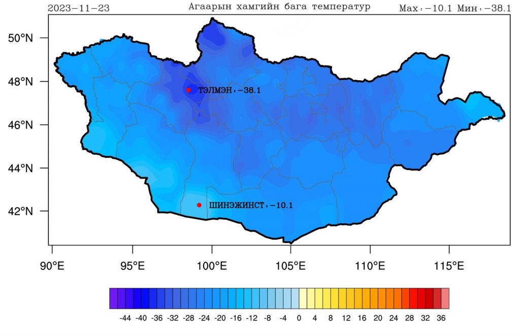 Өнгөрсөн шөнө Завхан аймгийн Тэлмэн суманд -38.1 градус хүрч хүйтэрсэн байна.