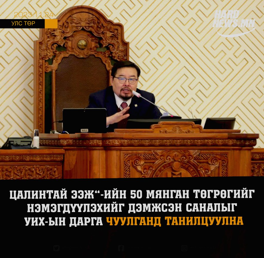 УИХ-ын дарга Г.Занданшатар "Иргэн Р.Цэндсүрэн цалинтай ээжийн 50 мянган төгрөгийг та дэмжиж байна уу? гэсэн цахим өргөдлийг D Parliament сайтад үүсгэсэн. Энэ санал иргэний 100 мянгаас дээш саналыг авсан. Нэг бол нэрийг нь солих, нөгөө бол мөнгөн дүнг нэмэх талаар яригдаж байна. Нэмэгдсэн өртгийн албан татварын буцаан олголтын хувь хэмжээг нэмэх, нийгмийн даатгалын шимтгэл, хувь хүний орлогын албан татварыг өөрчлөх гэдэг хоёр өргөдөл гаргасан. Энэ бол татварын цогц шинэчлэл хийх асуудал болсон учир ажлын хэсэг гаргасан. " гэв.