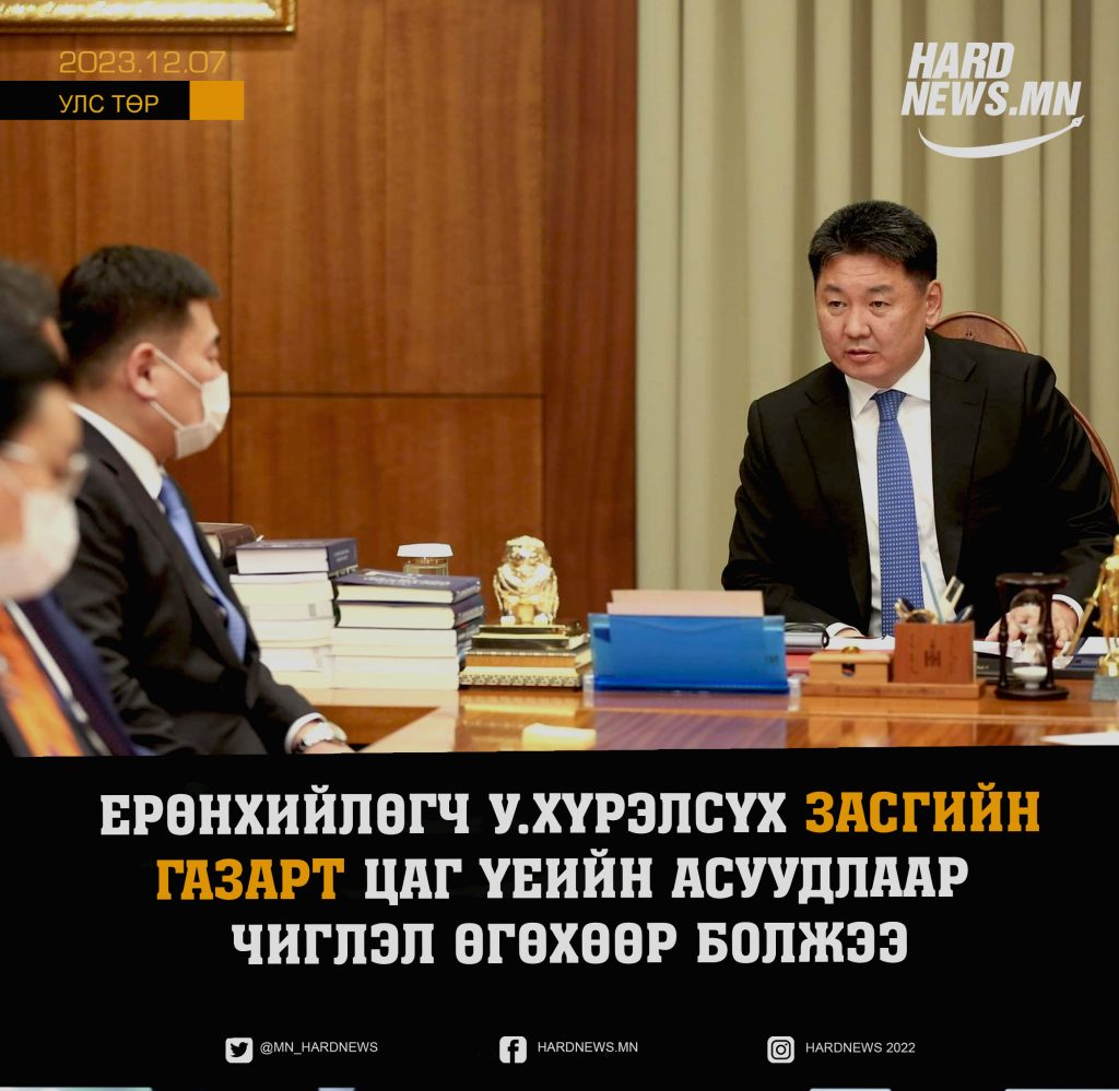 Монгол Улсын Ерөнхийлөгч У.Хүрэлсүх, Ерөнхий сайд Л.Оюун-Эрдэнэ, УИХ-ын дарга Г.Занданшатар болон ЗГХЭГ-ын дарга Д.Амарбаясгалан нар Төрийн ордонд уулзаж буй талаар бид өчигдөр мэдээлсэн. Тэгвэл Ерөнхийлөгч У.Хүрэлсүх цаг үеийн асуудлаар Засгийн газарт чиглэл өгөхөөр болжээ.