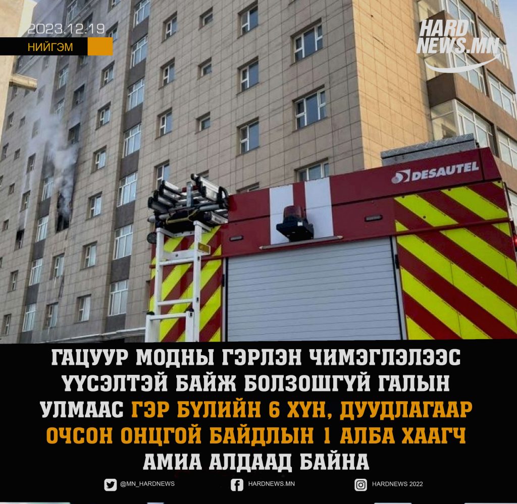 Өнөөдөр /2023.12.19/ өглөө 07:00 цагийн орчимд Хан-Уул дүүргийн гуравдугаар хорооны нутаг дэвсгэрт байрлах ... дугаар байрны дөрөвдүгээр давхарт гал гарч нэг том хүн, бага насны дөрвөн хүүхэд газар дээрээ нас барсан бол угаарын улмаас тухайн гэрт байсан 1 том хүн, мөн хэргийн газарт ажиллаж байсан Онцгой байдлын нэг алба хаагч эмнэлэгт хүргэгдээд амиа алдсан харамсалтай хэрэг гараад байна. Урьдчилсан байдлаар шинэ жилийн гацуур модны гэрлэн чимэглэлээс үүсэлтэй гал гарсан байж болзошгүй байгаа талаар албаны эх сурвалж мэдээллээ.