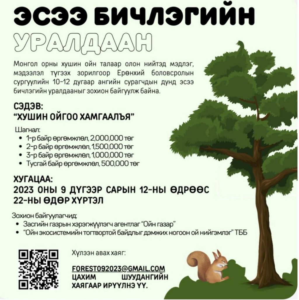 Монгол орны хушин ойн талаар олон нийтэд мэдлэг, мэдээлэл түгээх зорилгоор Ерөнхий боловсролын сургуулийн 10-12 дугаар ангийн сурагчдын дунд эсээ бичлэгийн уралдааныг зохион байгуулж байна.Сэдэв: "Хушин ойгоо хамгаалъя"Хугацаа: 2023.09.12-09.22-ны өдөр хүртэлХүлээн авах хаяг: forest092023@admin