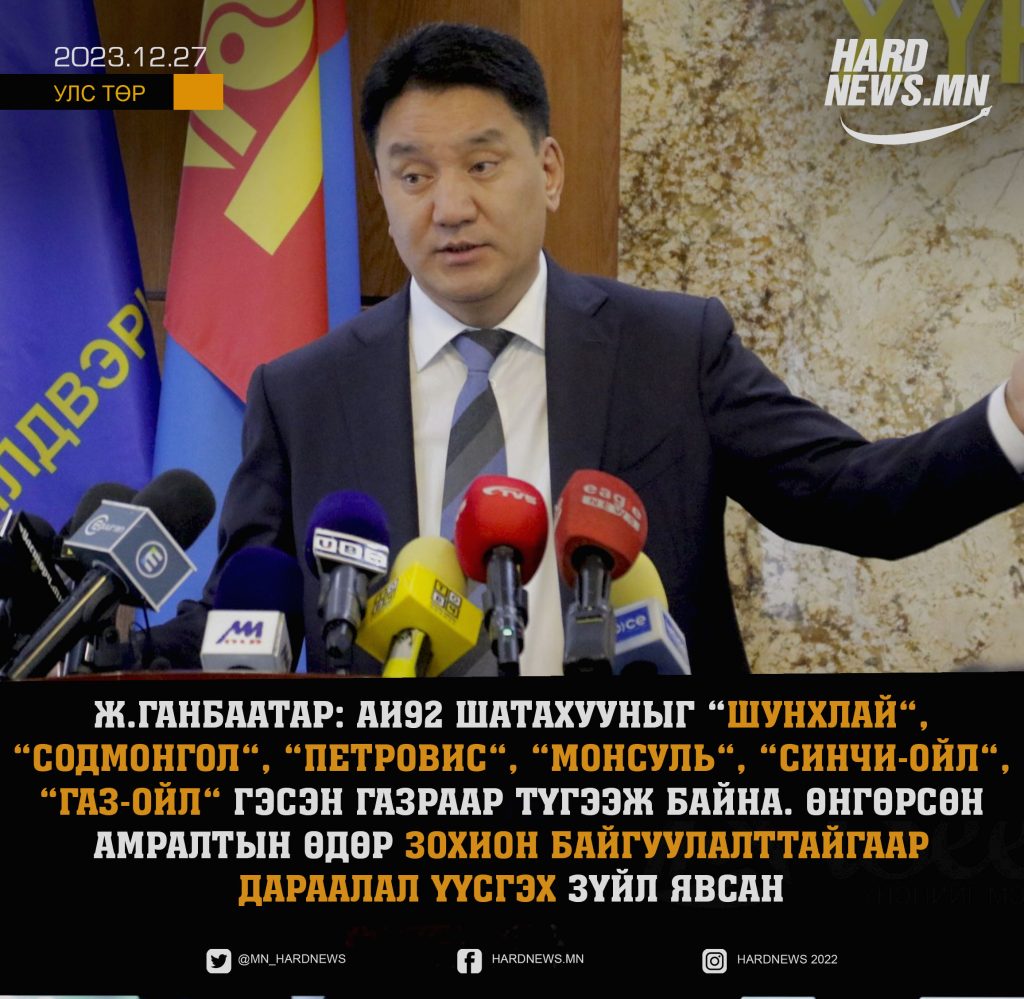 Тэрбээр "ШӨХТГ-тай хамтарч шатахуун колонкуудад хяналт шалгалт хийсэн. Яамнаас шалгаж байгаа, түүнээс шууд шаардлага тавих эрх байхгүй. Өнгөрсөн амралтын өдөр зохион байгуулалттайгаар дараалал үүсгэх зүйл явсан. Үүнийг хууль хяналтын байгууллагад шилжүүлсэн, шалгаж байгаа. Шунхлай, Содмонгол, Петровис, Монсуль, Синчи-Ойл, Газ-Ойл зэргээр АИ92 шатахууны түгээлт хийж байна. Бусад колонкод АИ92 байхгүй байна. Гэхдээ нөөц хангалттай бий" гэлээ.