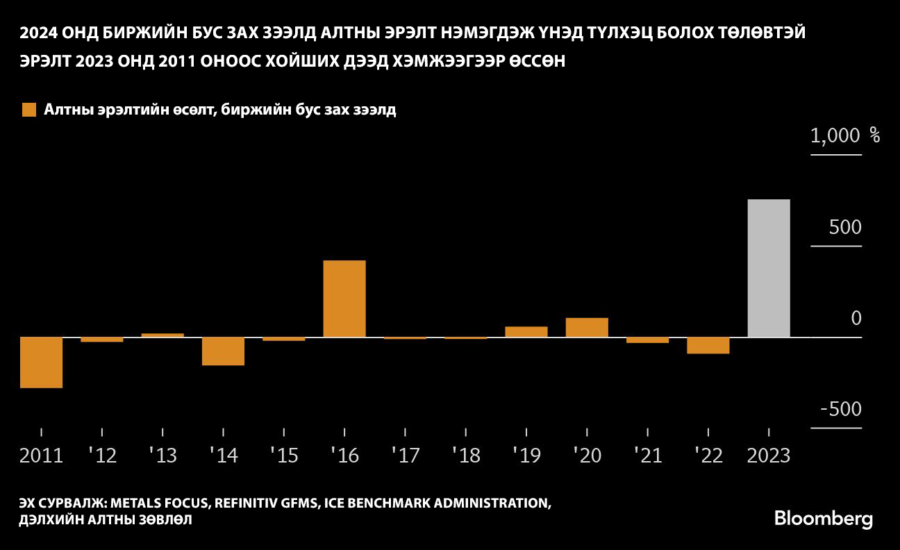 2023 онд алтны эрэлт дэлхийн хэмжээнд шинэ дээд түвшинд хүрсэн байна. АНУ-ын Холбооны Нөөцийн банк бодлогын хүүгээ бууруулах магадлал зах зээлд давамгайлж байгаатай холбоотойгоор энэ онд ч эрэлт өндөр байх төлөвтэй байгааг Дэлхийн алтны зөвлөл мэдээллээ. Тухайлбал: Төв банкнуудын алт худалдан авалт нэмэгдсэнээр эрэлт нь 2023 онд гурван хувиар өсөж 4899 тонн хүрсэн байна.