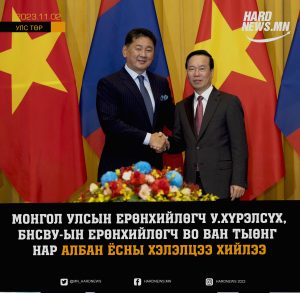 Монгол Улсын Ерөнхийлөгч У.Хүрэлсүх, БНСВУ-ын Ерөнхийлөгч Во Ван Тыөнг нар албан ёсны хэлэлцээ хийлээ Монгол Улсын Ерөнхийлөгч...